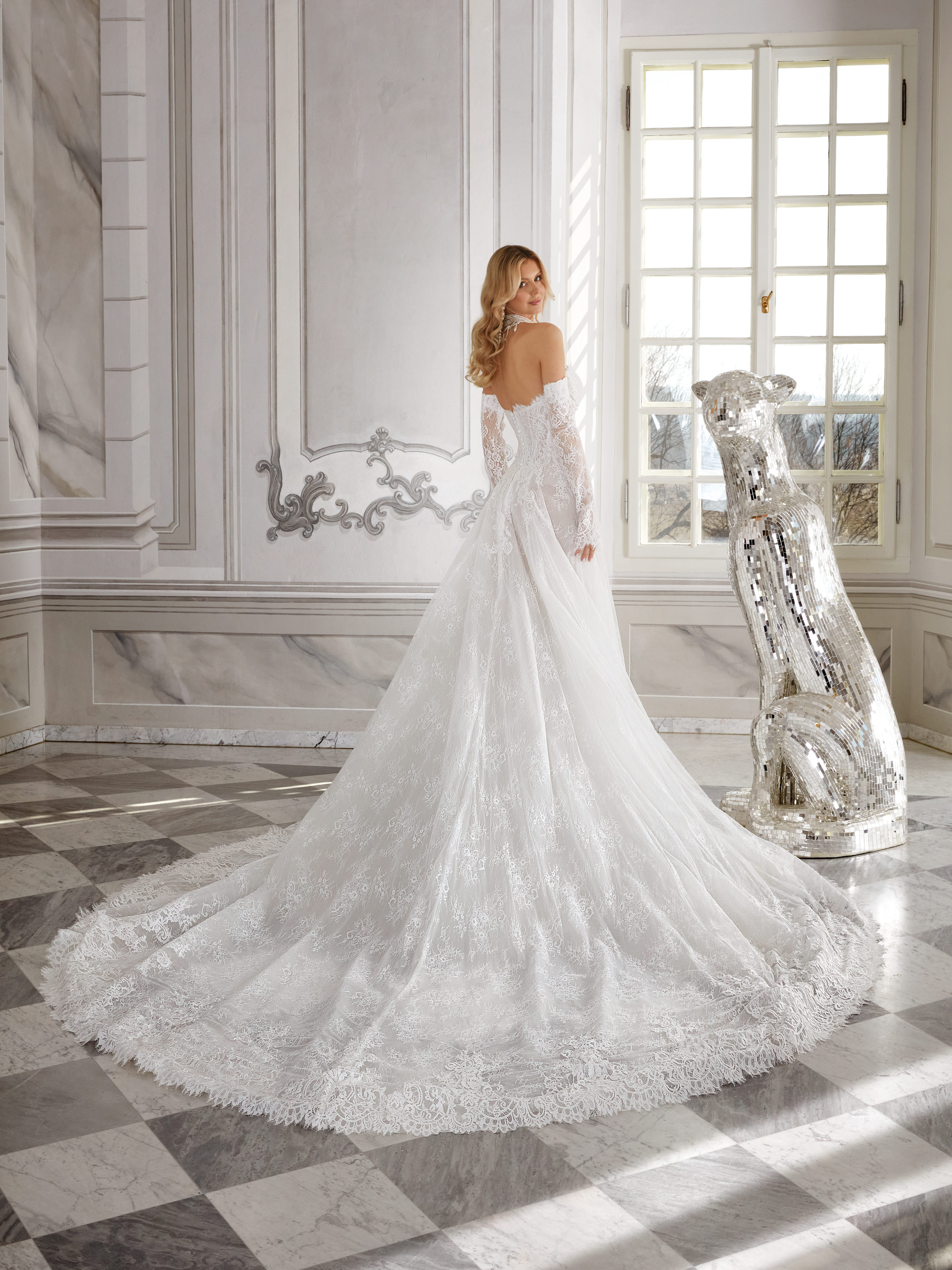 The lace Kendall gown combines classic and modern elements. The sheer skirt with a delicate underlayer creates a light and airy silhouette. The bodice is adorned with exposed French lace that gently wraps the body, while the long sleeves add elegance and sophistication. The look is completed by a dramatic cathedral train, emphasizing the gown’s majestic character.