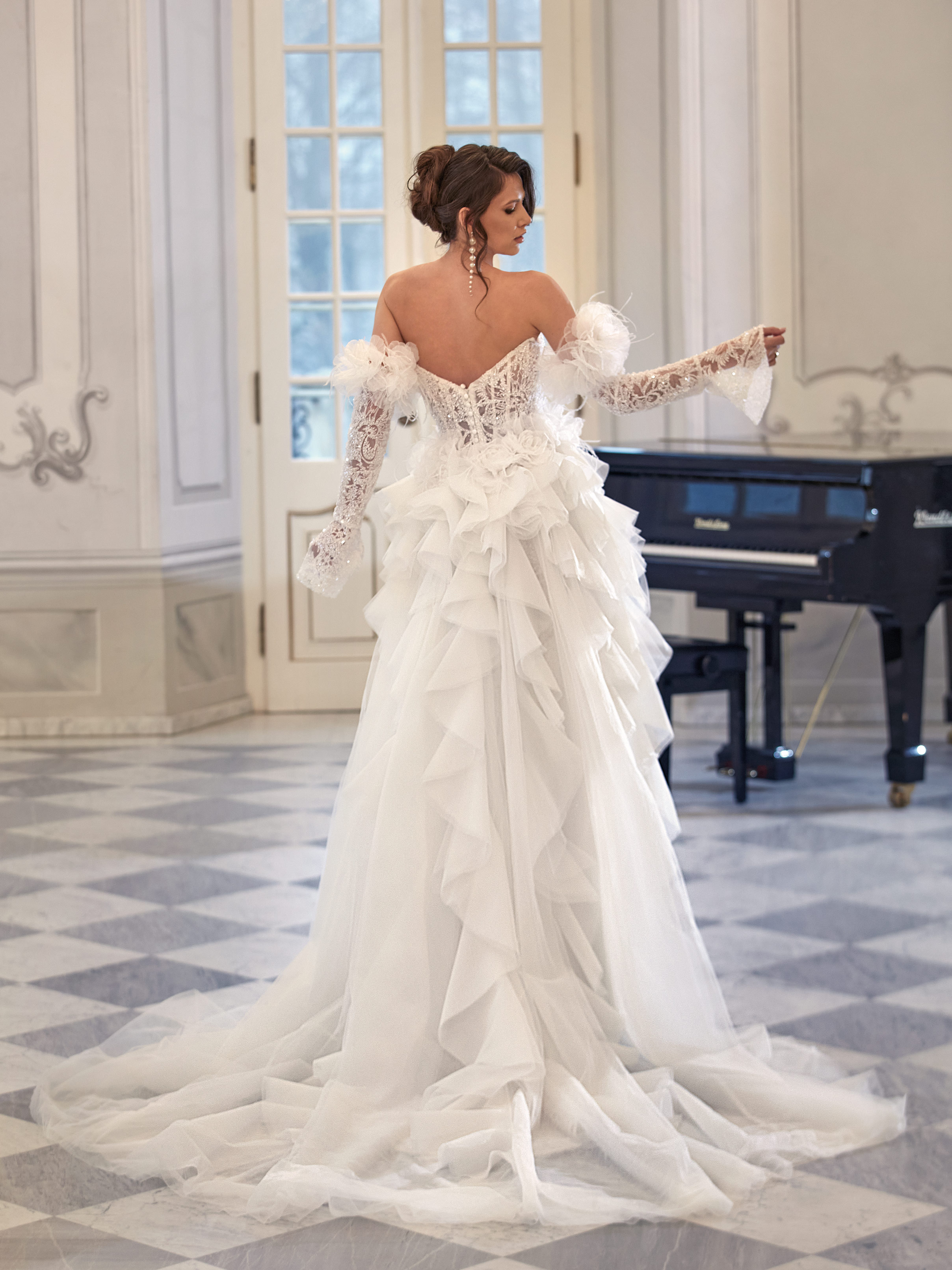 Nova is a striking bridal gown designed for brides who love to stand out. The off-the-shoulder lace bodice beautifully frames the neckline and shoulders, while the dramatic feather-trimmed sleeves add a touch of flair. The fitted lace-covered skirt enhances the figure, and the detachable tulle train with cascading ruffles creates a show-stopping silhouette with the option for a look transformation.